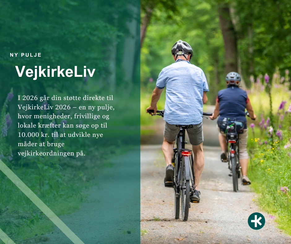 Når du støtter Kirkefondet, er du med til at give nye idéer vinger. Din støtte går direkte til VejkirkeLiv 2026 – en ny pulje, hvor menigheder, frivillige og lokale kræfter kan søge op til 10.000 kr. til at udvikle nye måder at bruge vejkirkeordningen på. Vejkirker har eksisteret i mere end 25 år, og stiller kirke til rådighed som et åbent rum for fordybelse, samtale og møder på tværs. Med det nye tiltag VejkirkeLiv ønsker vi at styrke det lokale engagement og skabe levende mødesteder, hvor mennesker oplever kirken på nye måder.