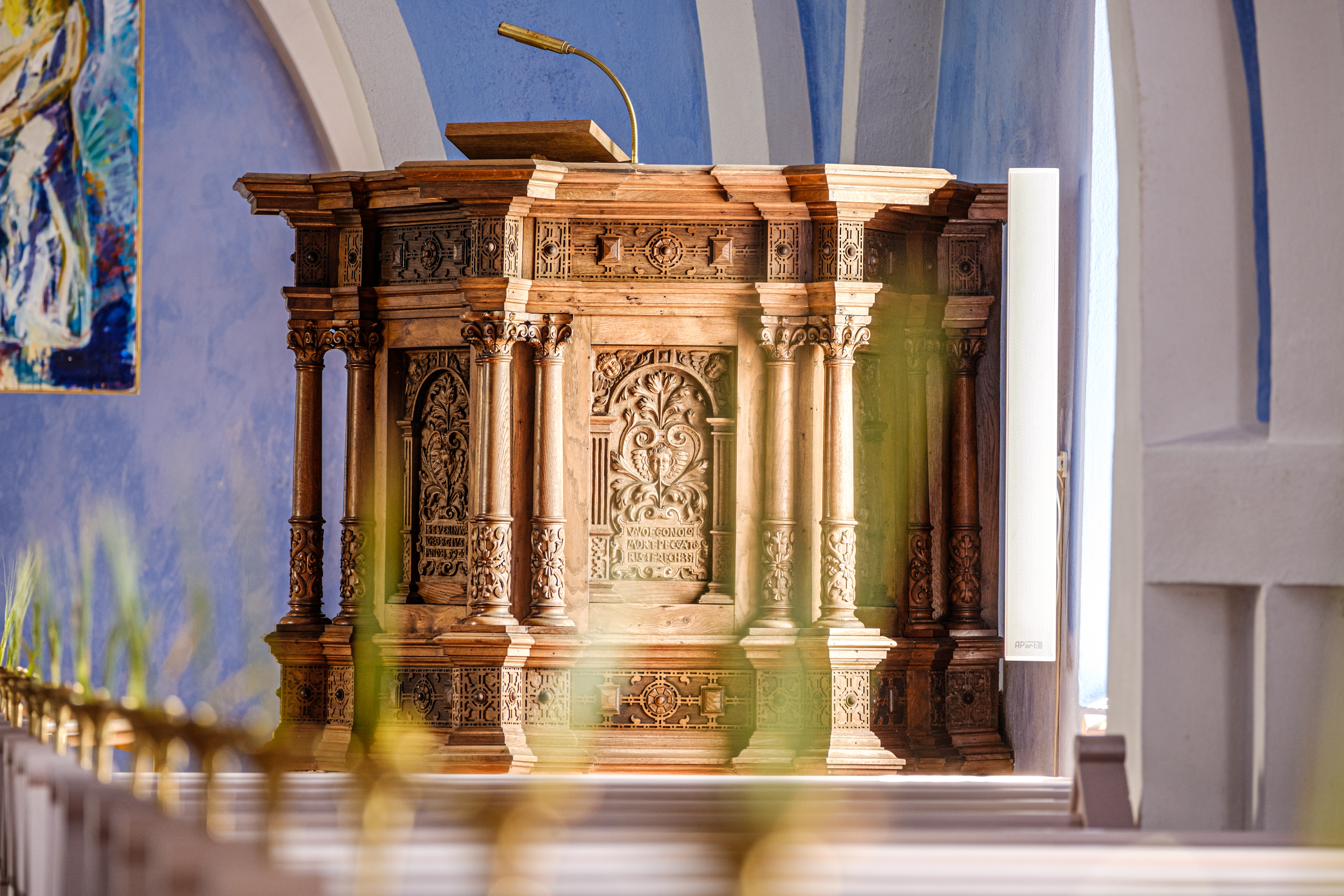 Alteret samler opmærksomheden. Her hænger en markant, tofløjet altertavle af den færøske kunstner Torbjørn Olsen. Når tavlen er åben, udfolder fem scener sig omkring Kristus – fra opstandelsen til mødet med den vantro Thomas. I fastetiden lukkes fløjene, og motivet skifter til tornekroningen i stærke, intense farver. Det er et bevidst kunstnerisk greb, der følger kirkeåret og giver rummet en dynamik, man mærker.